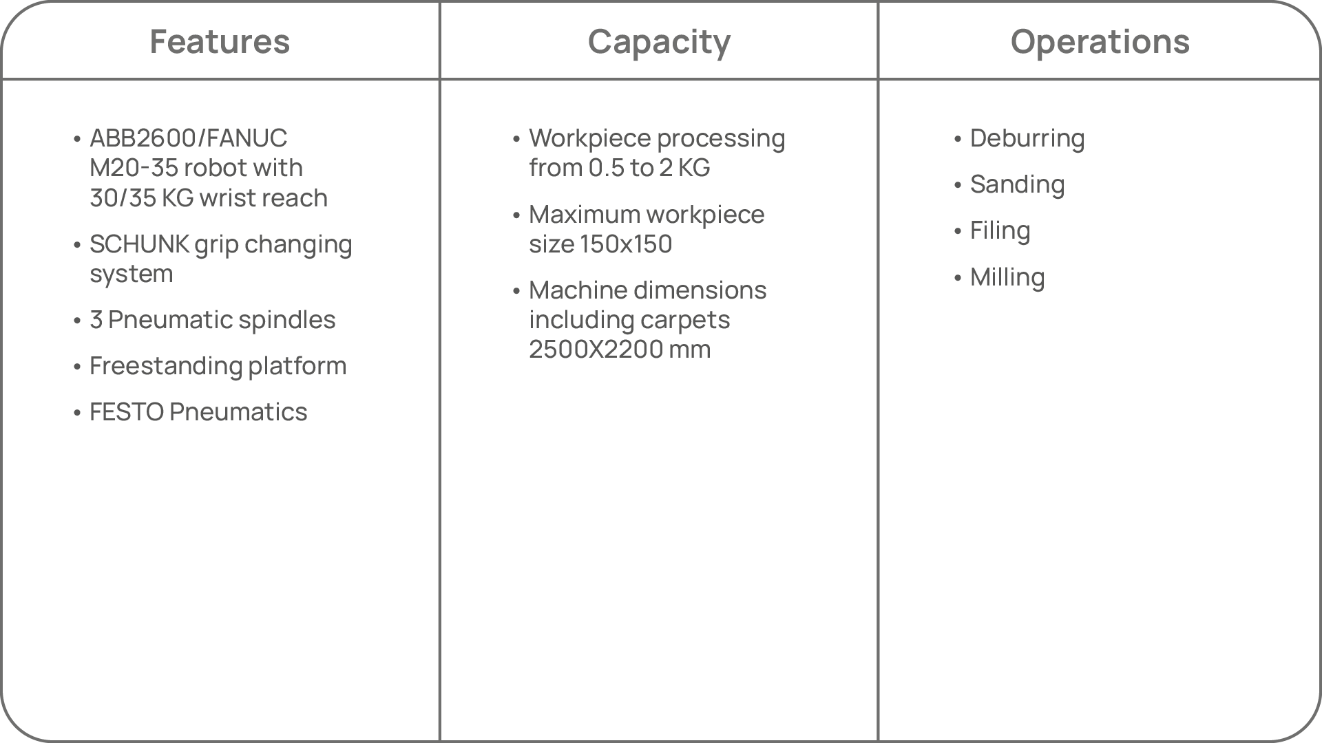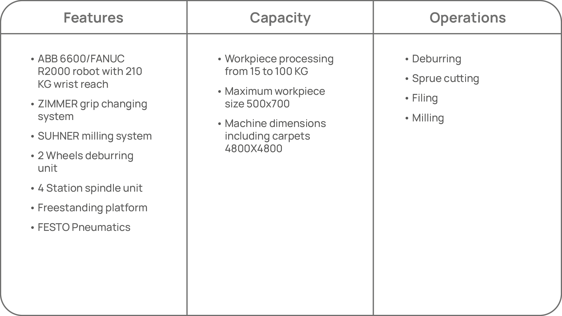 Ability to process components ranging from 15 to 100 kg, it’s able to perform precise cuts using a cutting station with a disk, grind surfaces, file the most difficult to reach areas and, finally, it is able to mill planes and pockets thanks to the milling station with a conical spindle.