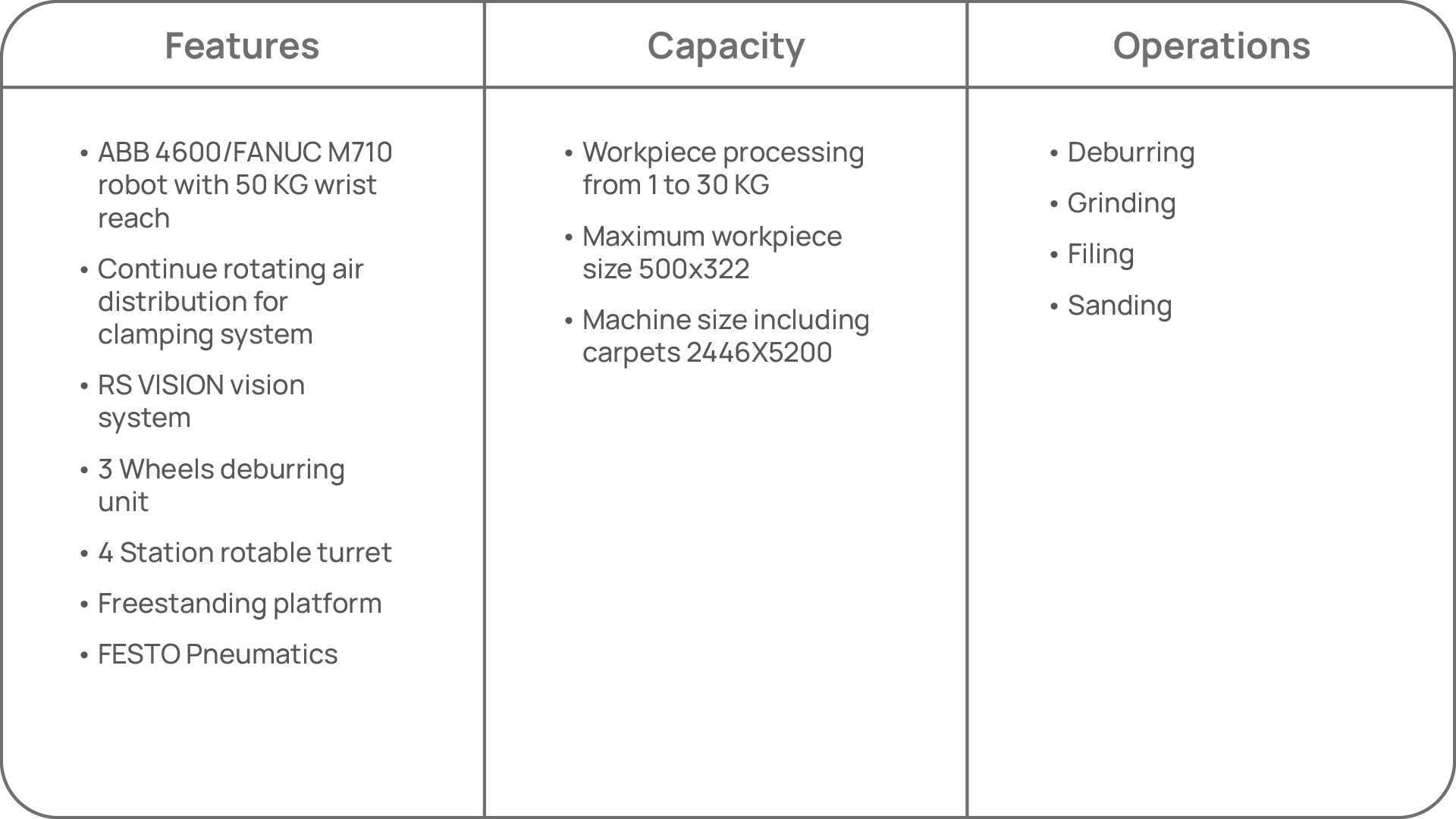 The RS Deburring 50, includes the missions in a single solution, is equipped with a belt deburring station on three compensated contact wheels, a flat sanding station and is equipped with a 360° indexed rotating station which allows filing and brushing operations to be performed with four compensated tools. The system is fed versatilely via two conveyors, one for loading and one for unloading, the components rest on the conveyors and are recognized via a precise robot-guided vision system.